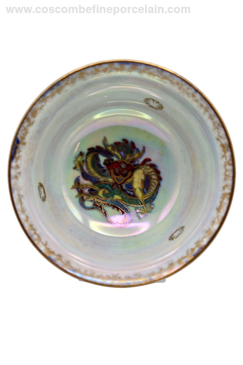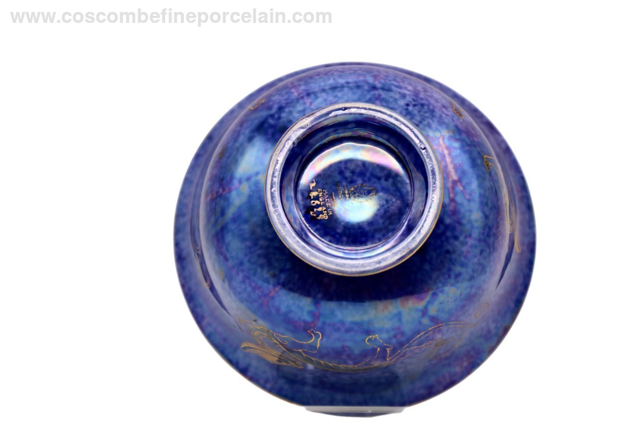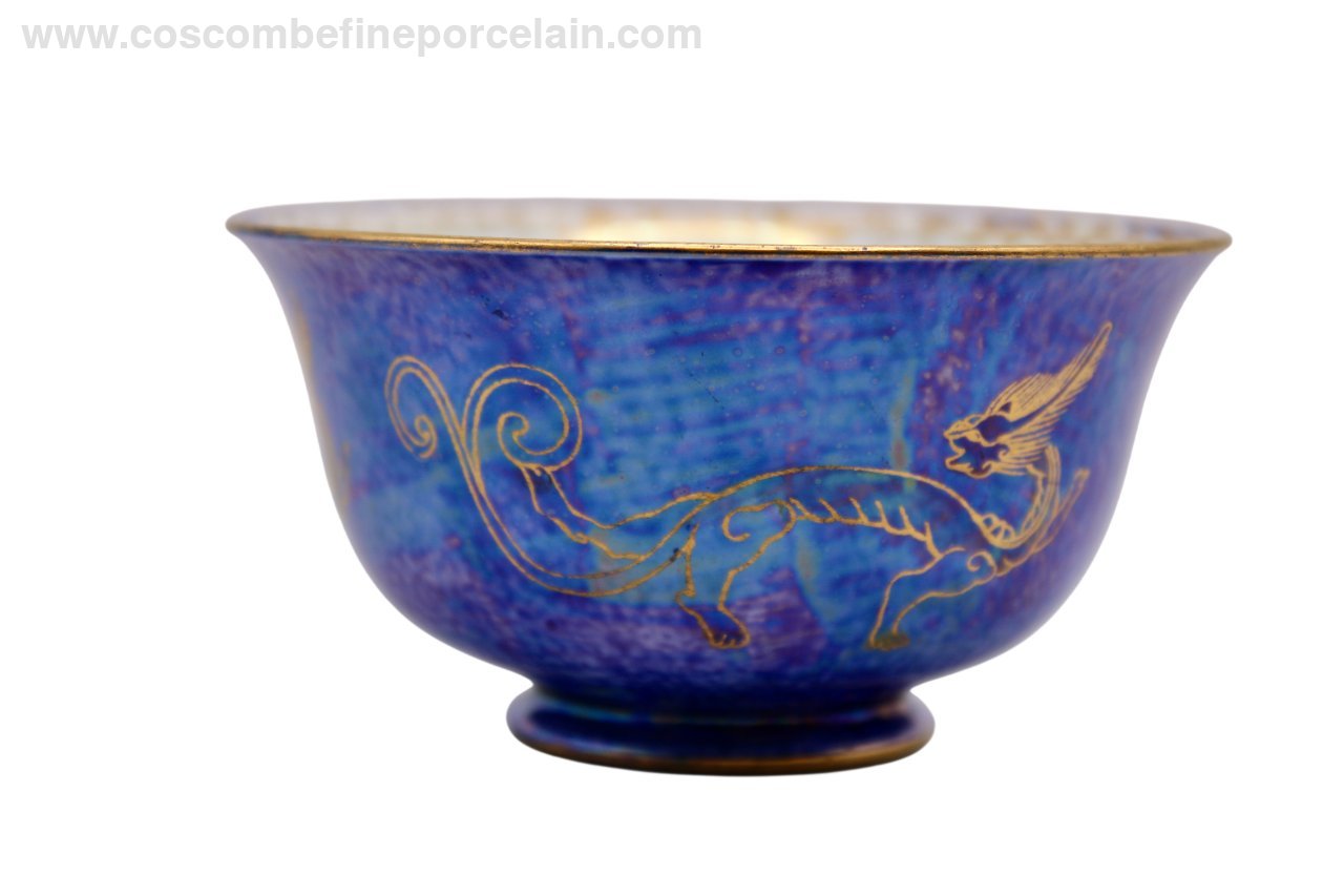Beautiful Wedgwood bowl in a mixed blue lustre with pale stainings and blue mottling, decorated with three gold Ch’ing Lung dragons circling the bowl. The inside of the bowl has a mother of pearl lustre with pale stainings and a gilded, multicoloured lustre Coiling dragon.