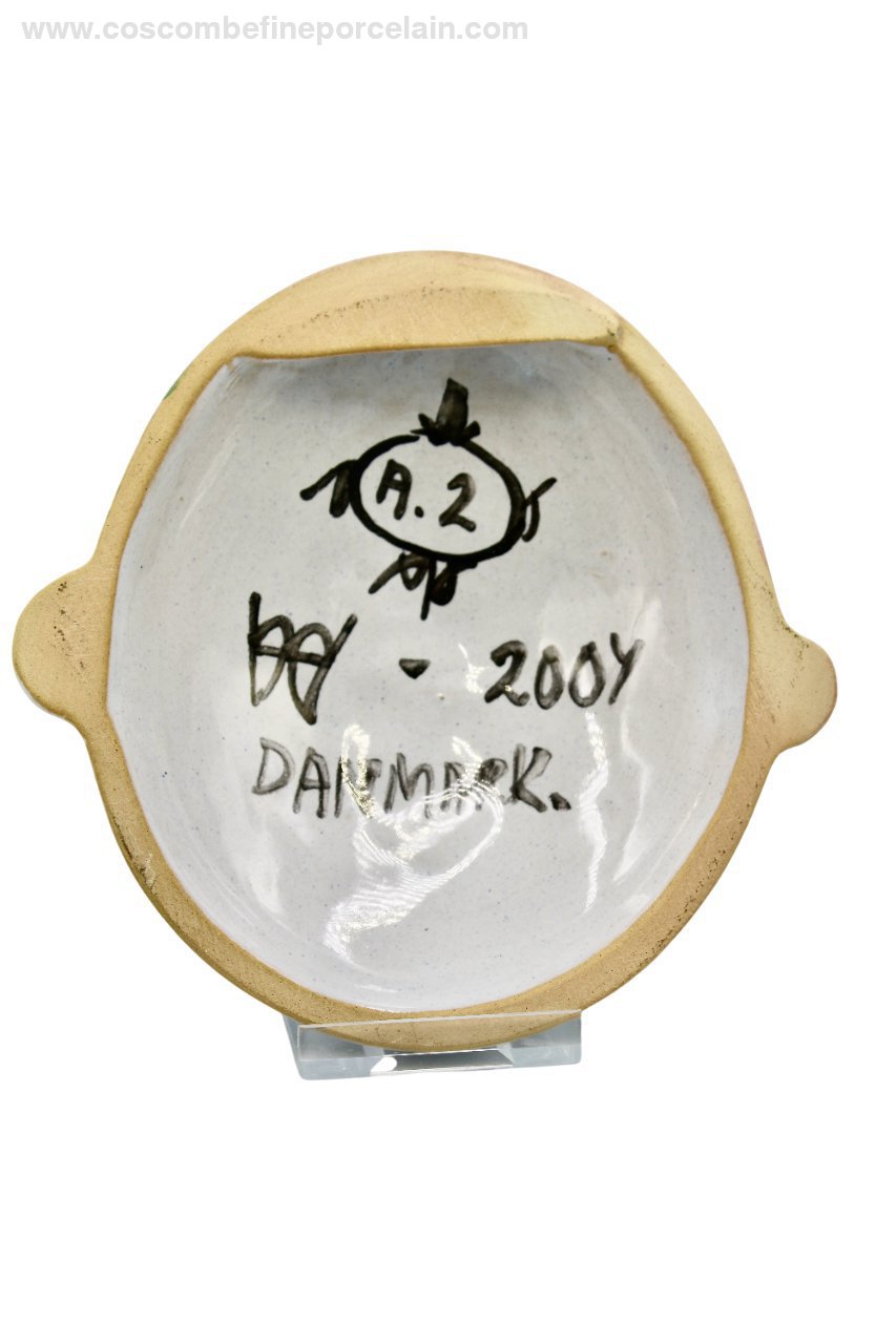 Bjørn Wiinblad (1918 – 2006), was a Danish painter, designer and artist in ceramics. Some of the most impressive work by Wiinblad comes from his own studio,  “Værksted”,  which started in 1952 in Copenhagen. Generally they are “fajance” ware – eathernware pieces with a white base glaze on which a coloured design is hand painted. Wiinblad designed all the pieces from his studio and painted many of them himself, although to keep up with the volume produced he had the help of a few painters. Wiinblad’s designs often featured whimsical characters, sometimes in quite bizarre costumes and headgear – in the forms of lady-head vases, figurines, sculptures, candlesticks, and jars. His own signature was a caricature of himself.