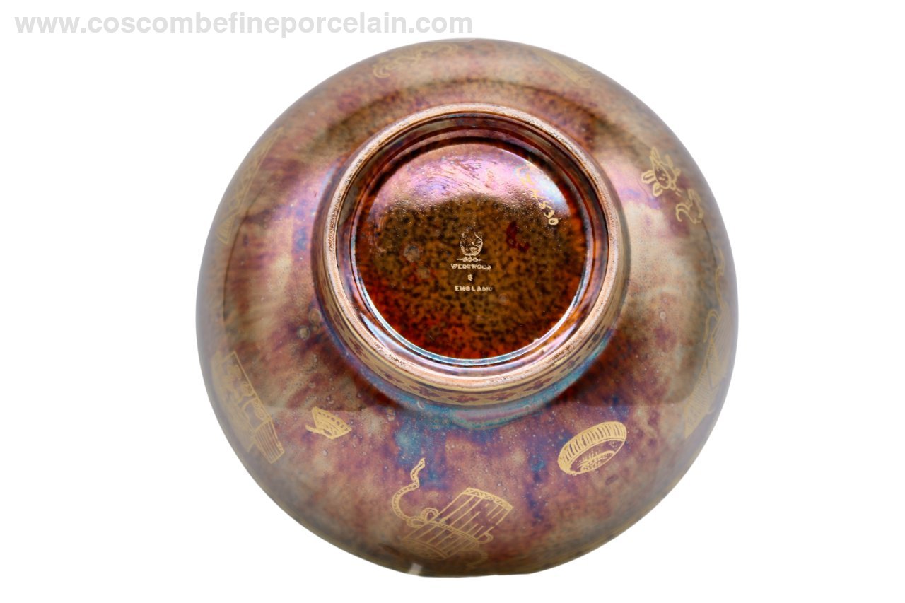 A large Boston cup shape bowl from Wedgwood, produced in an orange lustre with stainings and mottling being predominately blue and brown. The interior is lined with a rare mother of pearl lustre with green stainings. Gold Oriental motifs and symbols surround the bowl and a large multi coloured lustre butterfly sits centre.
