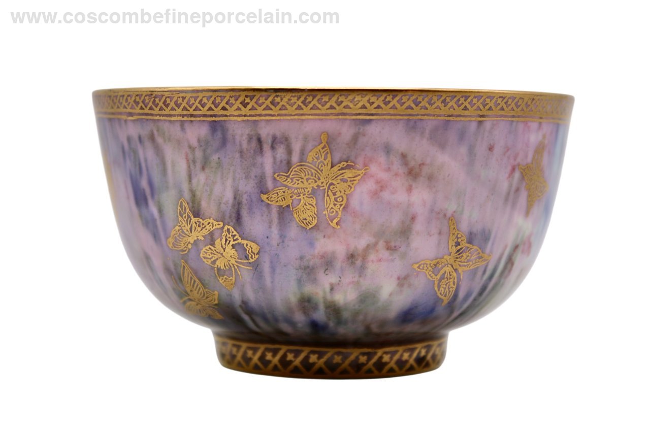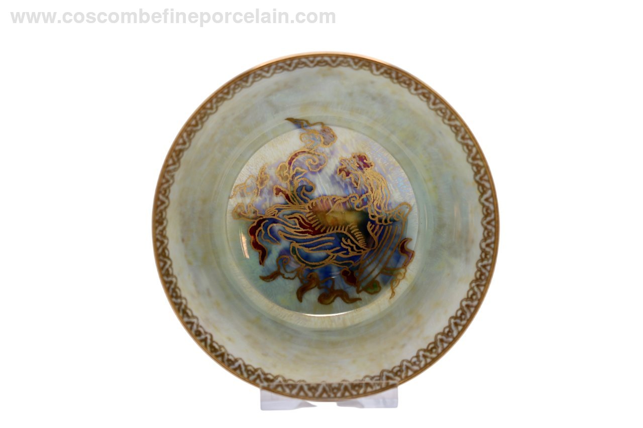 An unusual Boston Cup shape bowl from Wedgwood, circa 1920. It has been made in a rare green lustre with all colour mottling where the red has produced a purple lustre rather than the usual green. (Silver is the element mixed with glaze to produce the gorgeous green lustre, Gold is added for a red lustre, the pieces were more expensive to produce and there were less made). The bowl is lined with a mother of pearl lustre with pale stainings, a gold bead border and a multicoloured lustre Dragon.