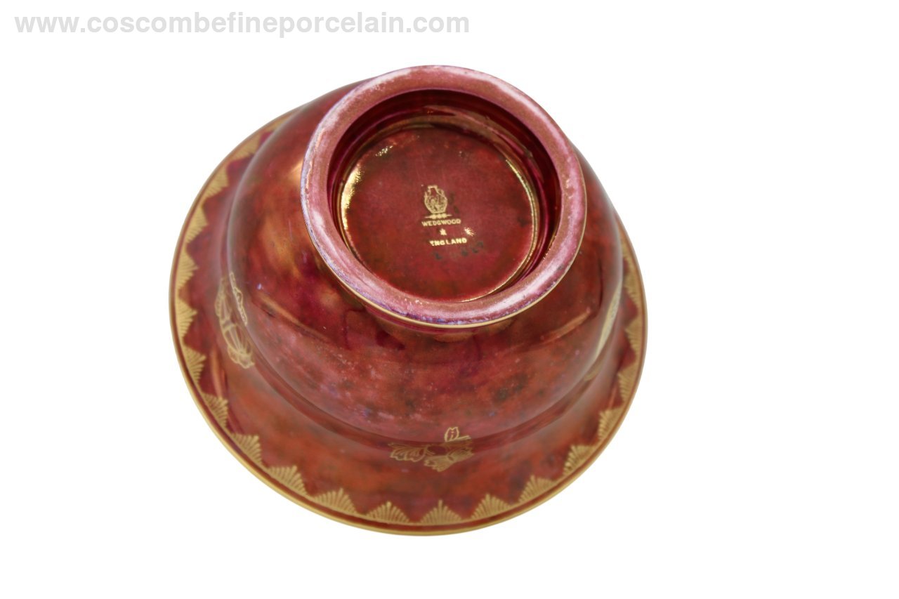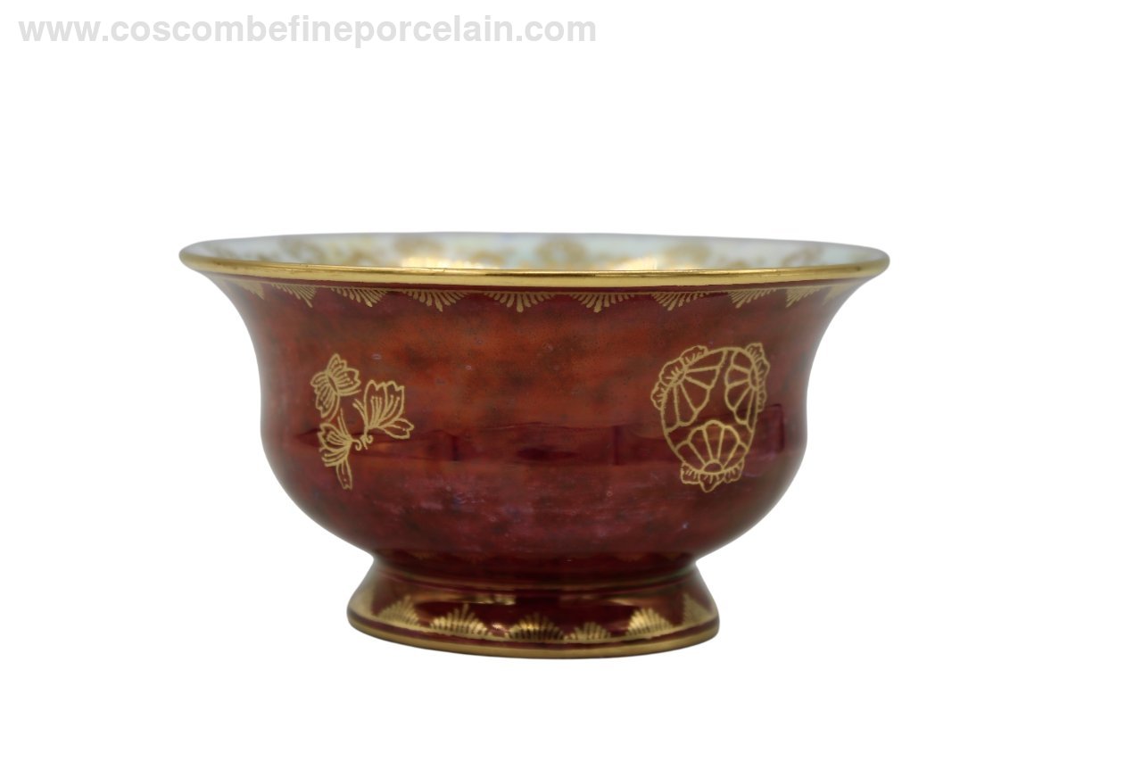 Beautiful Wedgwood bowl with the expensive ruby red (gold) lustre exterior and a mother of pearl interior with pale stainings, circa 1914. The outside of the bowl is decorated with gold Oriental motifs, the center of thr bowl with one large multicoloured butterfly. The rim is delicately gilded with a deep border.
